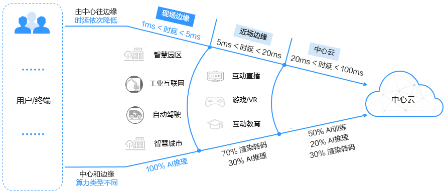 第二個“圈”是近場邊緣,覆蓋5~20ms時延范圍,算力以渲染為主,同時還有一部分推理,主要面向視頻場景。