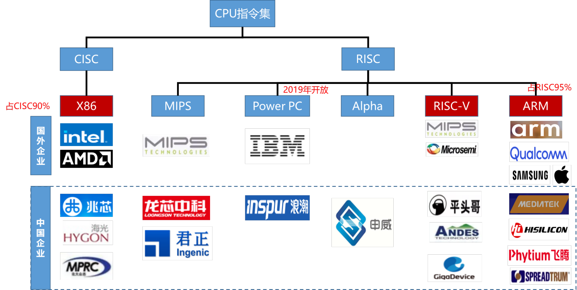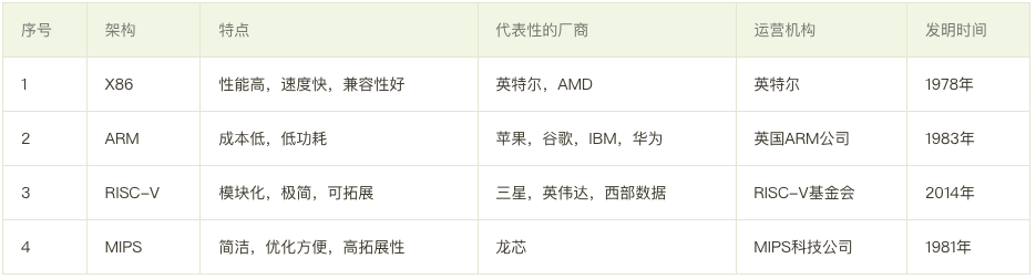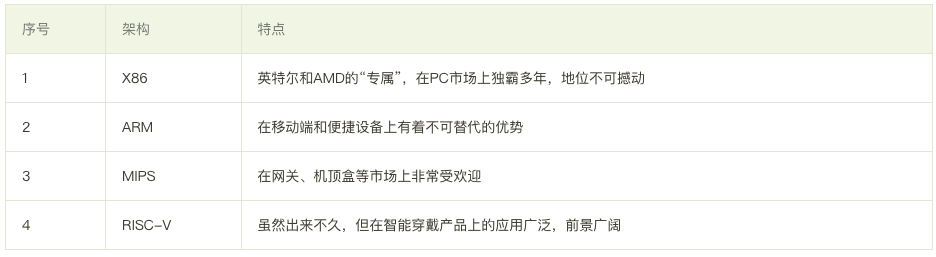 目前市場上主流的芯片架構有 X86、ARM、RISC-V和MIPS四種: