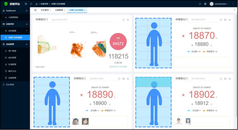 | 安檢機過包預(yù)覽 | 將安檢機的實時過包圖片展示到頁面上,并可按1/4宮格,同時展示多個安檢機、安檢門的過包和告警信息。若設(shè)備配置了攝像頭,可實時預(yù)覽攝像頭的畫面。 |