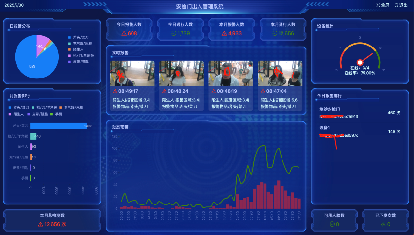 智能手機探測門安檢機系統由人臉識別攝像頭、門禁控制器+后臺管理系統則負責人臉識別、數據存儲、遠程控制等功能。系統架構可以采用集中式或分布式部署方式,根據實際需求進行選擇,系統支持上百臺智能手機探測門統一管理、數據集中存儲、可視孿生系統指揮預警