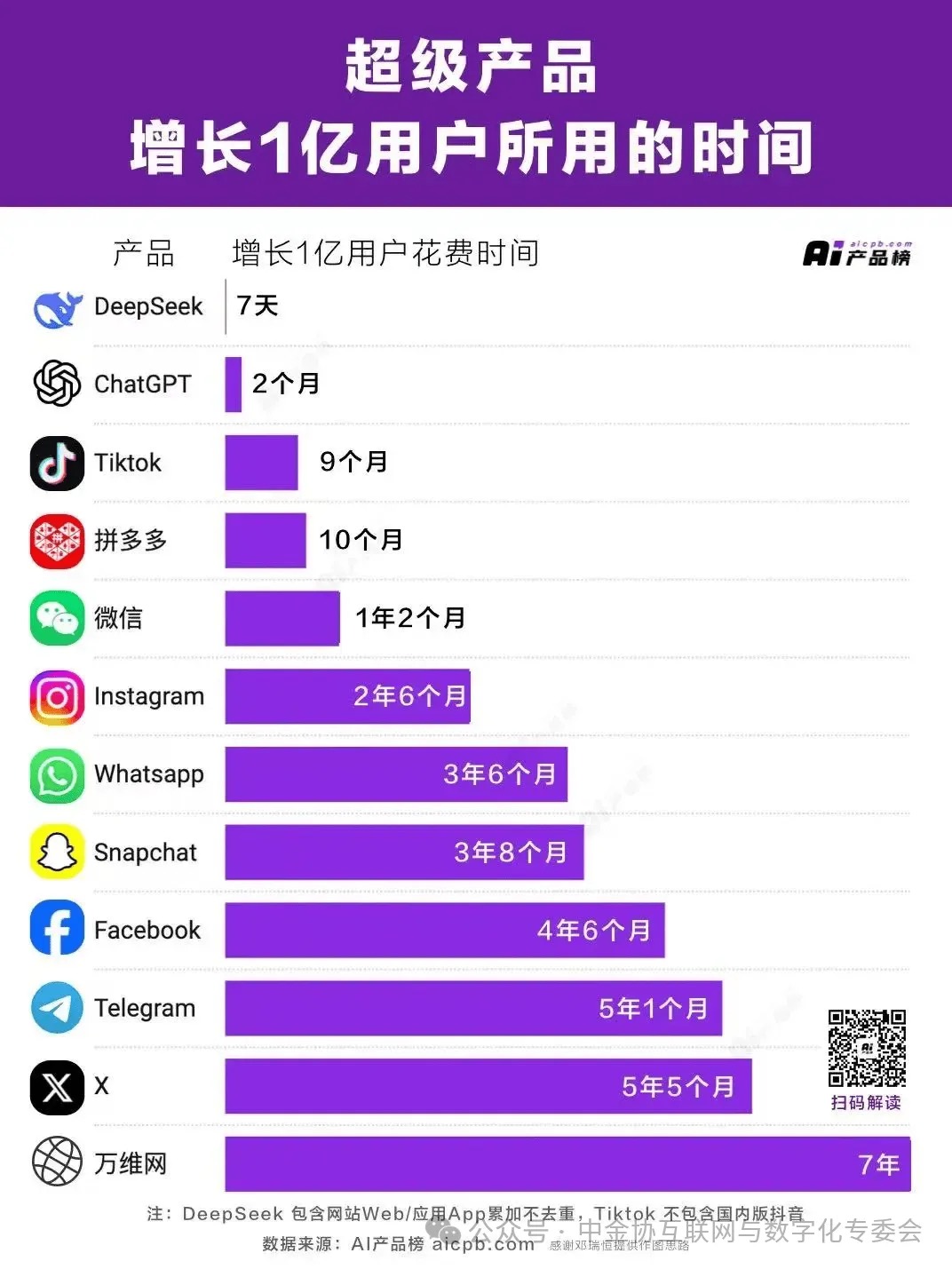 據AI產品榜的數據顯示,2025/01/20DeepSeek-R1 發布幾天后,在 1 月的最后一周迎來了爆發,DeepSeek 在 1 月累計獲得1.25 億用戶(含網站(Web)、應用(App)累加不去重)。其中 80% 以上用戶來自最后一周,即 DeepSeek 7 天完成了 1 億用戶的增長,這是在沒有任何廣告投放的情況下取得的,成為了名副其實的超級產品。
