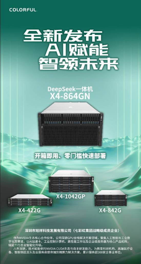 旭祥推出DeepSeek一體機型號為“X4-864GN”,搭載NVIDIA HGX高性能計算模組,適配DeepSeek全系列大模型,包括最新的V3基座模型、R1推理模型,以及其他蒸餾模型,可大幅降低DeepSeek模型部署的技術門檻。